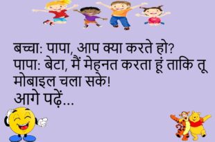 बच्चा: पापा, आप क्या करते हो?पापा: बेटा, मैं मेहनत करता हूं ताकि तू मोबाइल चला सके! 📱🤣 ************************************ गर्लफ्रेंड: सुनो, मुझे गोलगप्पे खाने हैं!बॉयफ्रेंड: मैं तो समझा थी ‘गोल’ फिगर की बात कर रही हो! 😜 ************************************ टीचर: बेटा, परीक्षा में फेल कैसे हो गए?पप्पू: सर, सवालों में इमोशन नहीं थे, कनेक्ट नहीं हुआ! 😅 ************************************ डॉक्टर: आपको दिन में …