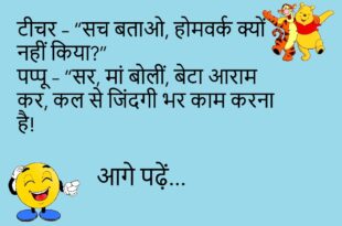टीचर – भारत की राजधानी क्या है? पप्पू – WhatsApp ग्रुप पर बदलती रहती है सर!😂😂😂 ************************************ टीचर – “अगर मैं तुम्हें एक आम दूं और फिर एक आम दूं, तो कितने आम हुए?” पप्पू – “चार!” टीचर – “कैसे?” पप्पू – “एक आपने दिया, तीन मैंने मान लिए!”😂😂😂 ************************************ टीचर – “सच बताओ, होमवर्क क्यों नहीं किया?” पप्पू – …