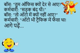 बॉस: “तुम ऑफिस क्यों देर से आए?” कर्मचारी: “सड़क बंद थी।” बॉस: “तो ऑटो में क्यों नहीं आए?” कर्मचारी: “ऑटो भी ट्रैफिक में फँसा था!”😊😊😊😊😊 ************************************** पप्पू: “यार, मेरी स्मार्टी गुम हो गई।” बंता: “कहां?” पप्पू: “जहां थी, वहीं है… बस याद नहीं!”😊😊😊😊😊 ************************************** मरीज: “डॉक्टर साहब, मुझे नींद नहीं आती।” डॉक्टर: “तो मोबाइल बंद कर दो!” मरीज: “नहीं, मोबाइल …