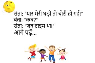 टीचर: “इतिहास क्या है?” पप्पू: “इतिहास वो है जो पिछले साल हुआ और अब पढ़ाई बन गया।”😊😊😊😊😊 ************************************** संता: “यार मेरी घड़ी तो चोरी हो गई!” बंता: “कब?” संता: “जब टाइम था!”😊😊😊😊😊 ************************************** पप्पू डॉक्टर के पास: “डॉक्टर साहब, मुझे भूलने की बीमारी हो गई है।” डॉक्टर: “कब से?” पप्पू: “कब से क्या?”😊😊😊😊😊 ************************************** सोनू: “यार तुम्हारी कार क्यों इतनी …