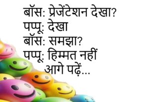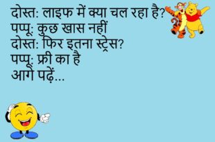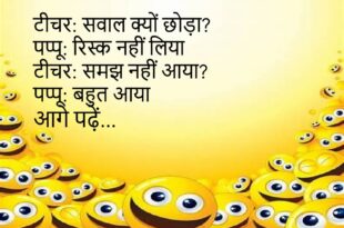 मां: सब्ज़ी फिर बच गई पप्पू: सेव कर ली मां: किसलिए? पप्पू: कल के लिए 😂 ********************************** टीचर: क्लास बोरिंग है? पप्पू: बिल्कुल नहीं टीचर: फिर नींद? पप्पू: एक्स्ट्रा इंटरेस्ट 😴 ********************************** दोस्त: शादी कब? पप्पू: सोच रहे हैं दोस्त: कौन? पप्पू: घरवाले 😆 ********************************** पापा: इतना मोबाइल क्यों? पप्पू: ज़माना है पापा: पढ़ाई? पप्पू: पुराना मॉडल 😜 ********************************** बॉस: …