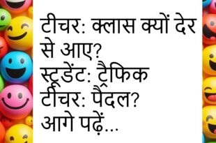 टीचर: क्लास क्यों देर से आए?स्टूडेंट: ट्रैफिकटीचर: पैदल?😊😊😊😊 ********************************** दोस्त: मूड कैसा है?लड़का: ठीकदोस्त: झूठ😊😊😊😊 ********************************** पिता: समझदारी दिखाओबेटा: पूरीपिता: फिर गलती क्यों?😊😊😊😊 ********************************** माँ: पढ़ाई हो गई?बेटा: लगभगमाँ: मतलब?😊😊😊😊 ********************************** टीचर: आखिरी सवालस्टूडेंट: सबसे मुश्किलटीचर: वही😊😊😊😊