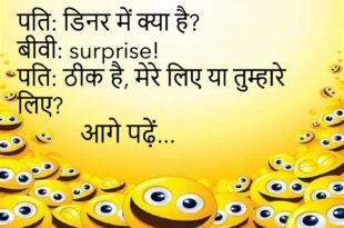 पप्पू: मम्मी, मुझे भूख लगी है। मम्मी: कुछ खा लो। पप्पू: हाँ, पर फ़ोन से 😜 ******************************************* पति: आजकल बीवी बहुत चुप है। दोस्त: क्यों? पति: शायद मुझे भूल गई है 😂 ******************************************* टीचर: बताओ सूरज और चाँद में क्या फर्क है? छात्र: सर, सूरज जलता है, चाँद मजाक करता है 🌙 ******************************************* पप्पू: मम्मी, स्कूल में आज क्या हुआ? …