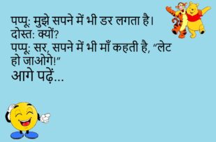 बच्चा: पापा, मुझे कहानियाँ सुनाओ।पापा: कौन सी?बच्चा: स्कूल की कहानी।😊😊😊😊 ***************************************** मम्मी: बेटा, पढ़ाई कर रहे हो?बच्चा: नहीं मम्मी, गेमिंग में हूँ।😊😊😊😊 ***************************************** पप्पू: मुझे सपने में भी डर लगता है।दोस्त: क्यों?पप्पू: सर, सपने में भी माँ कहती है, “लेट हो जाओगे!”😊😊😊😊 ***************************************** टीचर: बताओ, सबसे बड़ा ग्रह कौन सा है?बच्चा: सर, पेट, जब खाना पूरा हो गया हो।😊😊😊😊 ***************************************** …