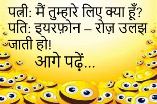 पति: मुझे अकेला रहने दो! पत्नी: तो जंगल चलो, वहाँ नेटवर्क भी नहीं मिलेगा! 😜 ************************************* बॉय: तुम्हें पहली बार कहां देखा था? गर्ल: Status Seen में! 😂 ************************************* डॉक्टर: कितनी बार कहा, Junk Food मत खाओ! पेशेंट: डॉक्टर साहब, ये junk नहीं, Instagram Food है! 🤣 ************************************* पत्नी: मैं तुम्हारे लिए क्या हूँ? पति: इयरफ़ोन — रोज़ उलझ जाती …