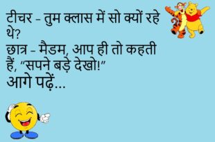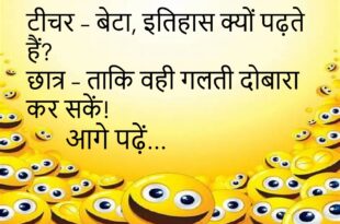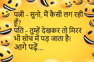 टीचर – बताओ, भारत का राष्ट्रीय फल कौन सा है?पप्पू – मोबाइल… हर जेब में मिलता है!😊😊😊😊 *********************************************** डॉक्टर – तुम्हें क्या परेशानी है?मरीज़ – बीवी बोलती है “तुम सुनते ही नहीं”…डॉक्टर – इलाज नहीं, भगवान का आशीर्वाद चाहिए!😊😊😊😊 *********************************************** पत्नी – सुनो, मैं कैसी लग रही हूँ?पति – तुम्हें देखकर तो मिरर भी सोच में पड़ जाता है!😊😊😊😊 *********************************************** …