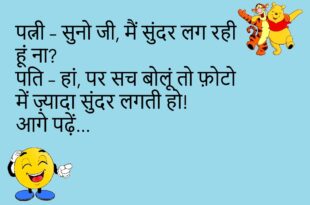 पत्नी – सुनो जी, मैं सुंदर लग रही हूं ना?पति – हां, पर सच बोलूं तो फ़ोटो में ज़्यादा सुंदर लगती हो! 🤭 ************************************************ टीचर – बच्चो, जल्दी बताओ “भारत का सबसे बड़ा राज्य कौन सा?”पप्पू – व्हाट्सएप ग्रुप वाला, उसमें हर कोई एड हो जाता है! 😅 ************************************************ डॉक्टर – तुम्हें क्या तकलीफ़ है?मरीज़ – नींद नहीं आती डॉक्टर …