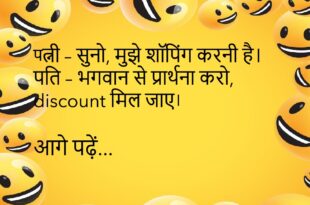 पप्पू – मैं बड़ा आदमी बनूँगा। टीचर – कैसे? पप्पू – पापा कहते हैं, शादी के बाद भी खुश रहने वाला बड़ा आदमी होता है।😊😊😊😊 *************************************** गर्लफ्रेंड – मैं गुस्से में कैसी लगती हूँ? बॉयफ्रेंड – वैसी, जैसे Facebook का error 404।😊😊😊😊 *************************************** डॉक्टर – आपको कौन सी बीमारी है? मरीज – बीवी की बातें भूलता ही नहीं।😊😊😊😊 *************************************** पत्नी …