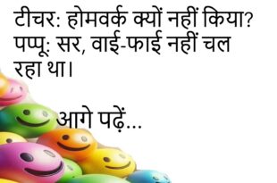 पत्नी: मेरी आँखों में क्या देख रहे हो? पति: धैर्य… बहुत धैर्य।😊😊😊😊 ******************************************* शिक्षक: भारत की राजधानी कौन सी है? पप्पू: फेसबुक!😊😊😊😊 ******************************************* टीचर: होमवर्क क्यों नहीं किया? पप्पू: सर, वाई-फाई नहीं चल रहा था।😊😊😊😊 ******************************************* पति: तुम मुझे छोड़कर चली गई तो मैं मर जाऊँगा। पत्नी: अच्छा! तो कब जा रही हूँ बताऊँ क्या?😊😊😊😊 ******************************************* पत्नी: सुनो, मैं मायके …
