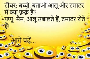 टीचर: बच्चों, बताओ आलू और टमाटर में क्या फ़र्क़ है?पप्पू: मैम, आलू उबालते हैं, टमाटर रोते हैं!😊😊😊😊 *************************************** बॉस: तुम ऑफिस देर से क्यों आए?कर्मचारी: सर, नींद की वजह से!बॉस: और ट्रैफ़िक?कर्मचारी: सर, वो भी नींद में ही था!😊😊😊😊 *************************************** पत्नी: आप मुझसे प्यार करते हैं?पति: हाँ, ज़िंदगी भर!पत्नी: सच?डॉक्टर: आपको नींद नहीं आती?पेटेंट: नहीं, रोज़ एक नई परेशानी आती …