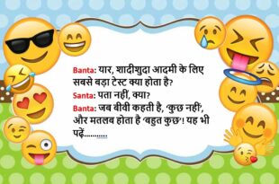 Santa: यार बंता, मेरी बीवी मुझसे बहुत परेशान रहती है। Banta: क्यों? Santa: मैंने उसे बताया कि मैं भगवान की तरह हूँ। Banta: फिर? Santa: अब वो हमेशा कहती है, भगवान हो तो कुछ काम कर!🤣🤣🤣😝😝😝😆🤣 ************************************************************************************** Banta: सुना, तुम्हारे बेटे की शादी हो गई? Santa: हाँ, और पता है? मेरी बीवी बोली, अब हमारे घर दो लोग ‘नो’ बोलने …