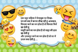 जीजा- तुम लड़कियां इतनी खूबसूरत क्यों हो? साली- भगवान ने हमें अपने हाथों से बनाया है जीजा- बोल तो ऐसे रही हो, जैसे हमें तो भगवान ने मजदूरों को ठेके पर दिया था…..😆🤣🤣🤣🤣😝😝😝 ************************************************************************************** साली (जीजा से)- ‘साली आधी घरवाली’ इस मुहावरे का अर्थ बताओ? जीजा- ये वो स्कीम है जो दूल्हे को बताई जाती है, लेकिन दी नहीं जाती….😆🤣🤣🤣🤣😝😝😝 …