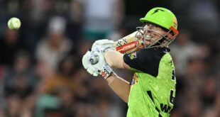 3 जनवरी को सिडनी शोग्राउंड स्टेडियम में बिग बैश लीग (BBL) 2025-26 के एक रोमांचक मैच में, सिडनी थंडर के कप्तान **डेविड वार्नर** ने **65 गेंदों पर नाबाद 130 रन** (11 चौके, 9 छक्के) बनाए, जिससे उनकी टीम **205/4** के स्कोर तक पहुंची। यह उनका नौवां T20 शतक था, जिससे वह क्रिस गेल (22) और बाबर आज़म (11) के बाद …