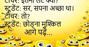 टीचर: जवाब गलत क्यों है?स्टूडेंट: सर, सवाल मुश्किल था।टीचर: और पढ़ना?स्टूडेंट: और मुश्किल 😄 ***************************************माँ: जल्दी उठ जाया कर।बेटा: क्यों?माँ: लोग क्या कहेंगे?बेटा: कि सो रहा है 😴 ***************************************दोस्त: लाइफ में सबसे जरूरी क्या है?मैं: चार्जर।दोस्त: प्यार नहीं?मैं: पहले चार्ज 😜 ***************************************पत्नी: मेरी बात सुन रहे हो?पति: हाँ।पत्नी: क्या कहा मैंने?पति: यही कि सुन रहे हो 😆 ***************************************टीचर: इतना लेट …