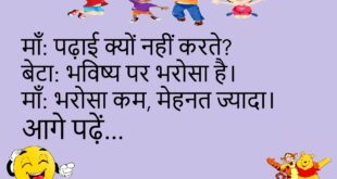 पापा: खर्च कहाँ हुआ? बेटा: सीखने में। पापा: महँगी क्लास है।😊😊😊😊 ************************************* पत्नी: मैं कैसी लग रही हूँ? पति: शानदार। पत्नी: सच? पति: जान बचाने वाला।😊😊😊😊 ************************************* डॉक्टर: नींद पूरी लेते हो? मरीज: ऑफिस में। डॉक्टर: घर कब जाते हो?😊😊😊😊 ************************************* दोस्त: आजकल चुप क्यों? जवाब: बैटरी लो है। दोस्त: चार्ज कब?😊😊😊😊 ************************************* माँ: पढ़ाई क्यों नहीं करते? बेटा: भविष्य …