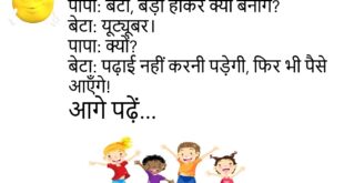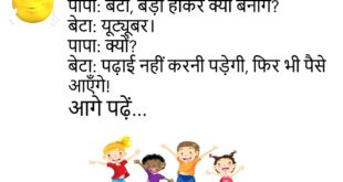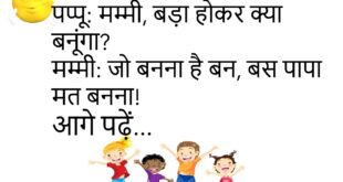 बच्चा: पापा, चाँद हमसे इतना दूर क्यों है? पापा: ताकि तुम उसे तोड़ न सको!😊😊😊 *************************************** दोस्त: यार तेरा वाई-फ़ाई पासवर्ड क्या है? दूसरा दोस्त: “मम्मीपापाकानाम”। पहला: कनेक्ट नहीं हो रहा। दूसरा: छोटे अक्षरों में लिखो!😊😊😊 *************************************** सांता: यार बंता, मैंने नई कार खरीदी है। बंता: कितने की? सांता: १० लाख की। बंता: वाह! कितनी किस्तों में? सांता: सिर्फ़ एक… …