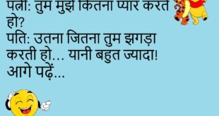 पत्नी: तुम्हें मेरी कसम, सच बताना! पति: ठीक है… लेकिन पहले कसम वापस ले लो।😊😊😊😊 **************************************** दोस्त: तेरा चेहरा क्यों सूजा है? दूसरा: गलती से घर देर से पहुँच गया था।😊😊😊😊 **************************************** लड़की: मुझे ना कुछ खाने का मन करता है। लड़का: चलो गोलगप्पे खाते हैं। लड़की: हाँ वही खाऊँगी।😊😊😊😊 **************************************** पप्पू: यार मेरी लाइफ में क्या कमी है? गप्पू: …