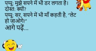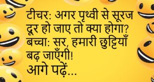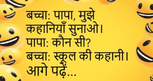 बच्चा: पापा, मुझे कहानियाँ सुनाओ।पापा: कौन सी?बच्चा: स्कूल की कहानी।😊😊😊😊 ***************************************** मम्मी: बेटा, पढ़ाई कर रहे हो?बच्चा: नहीं मम्मी, गेमिंग में हूँ।😊😊😊😊 ***************************************** पप्पू: मुझे सपने में भी डर लगता है।दोस्त: क्यों?पप्पू: सर, सपने में भी माँ कहती है, “लेट हो जाओगे!”😊😊😊😊 ***************************************** टीचर: बताओ, सबसे बड़ा ग्रह कौन सा है?बच्चा: सर, पेट, जब खाना पूरा हो गया हो।😊😊😊😊 ***************************************** …