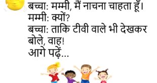 बच्चा: मम्मी, मैं नाचना चाहता हूँ।मम्मी: क्यों?बच्चा: ताकि टीवी वाले भी देखकर बोले, वाह!😊😊😊😊 ***************************************** दोस्त: तुम स्कूल क्यों नहीं गए?पप्पू: सर, छुट्टी थी।दोस्त: कौन सी छुट्टी?पप्पू: स्कूल से!😊😊😊😊 ***************************************** टीचर: बताओ, कौन सी चीज़ हमेशा बढ़ती है?बच्चा: सर, भूख!😊😊😊😊 ***************************************** पति: तुम्हारे लिए कुछ करूँ?पत्नी: हाँ, खाना खा लो।😊😊😊😊 ***************************************** पप्पू: मुझे नौकरी चाहिए।दोस्त: किस क्षेत्र में?पप्पू: हँसी का, …