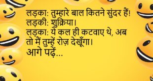 बॉस: तुम लेट क्यों आये?कर्मचारी: सर, सपने में ऑफिस आ गया था, इसलिए नींद पूरी नहीं हुई।😊😊😊😊 ***************************************** लड़का: तुम्हारे बाल कितने सुंदर हैं!लड़की: शुक्रिया।लड़का: ये कल ही कटवाए थे, अब तो मैं तुम्हें रोज़ देखूँगा।😊😊😊😊 ***************************************** बच्चा: मम्मी, मैं स्कूल नहीं जाऊँगा।मम्मी: क्यों?बच्चा: वहाँ हँसी की क्लास नहीं होती!😊😊😊😊 ***************************************** पप्पू डॉक्टर के पास गया।डॉक्टर: खांसी है?पप्पू: नहीं, सर, …