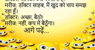 डॉक्टर: आपको क्या परेशानी है?मरीज: डॉक्टर साहब, मैं खुद को चाय समझ रहा हूँ।डॉक्टर: अच्छा, बैठो!मरीज: नहीं, कप में बैठूँगा।😊😊😊😊 ***************************************** पप्पू: यार मेरी किस्मत खराब है।गप्पू: क्यों?पप्पू: ATM में पैसा था, पर कार्ड घर पर!😊😊😊😊 ***************************************** पत्नी: सुनो, तुम मुझसे लड़ते क्यों नहीं?पति: क्योंकि मैं अपनी प्रॉपर्टी को नुकसान नहीं पहुँचाता!😊😊😊😊 ***************************************** बेटा: पापा, आपने शादी क्यों की?पापा: बेटा, …