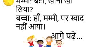 पापा: बेटा, तुमने होमवर्क किया? बेटा: हाँ, पापा, मैंने सोचा कि कल फिर से कर लूँगा।😊😊😊😊😊 ****************************************** डॉक्टर: बीपी बहुत बढ़ गया है। मरीज़: सर, बीवी की बातें सुनकर।😊😊😊😊😊 ****************************************** दोस्त: तुम शादी क्यों नहीं कर रहे? दोस्त 2: क्योंकि फ्री WIFI नहीं है।😊😊😊😊😊 ****************************************** मम्मी: बेटा, खाना खा लिया? बच्चा: हाँ, मम्मी, पर स्वाद नहीं आया।😊😊😊😊😊