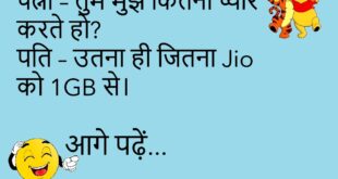 पत्नी – तुम मुझे कितना प्यार करते हो?पति – उतना ही जितना Jio को 1GB से।😊😊😊😊 ********************************************** बच्चा – पापा, पढ़ाई कब काम आएगी?पापा – जब बीवी से बहस करोगे।😊😊😊😊 ********************************************** गर्लफ्रेंड – मैं नाराज़ हूँ।बॉयफ्रेंड – ठीक है, अब खुश होने का भी पासवर्ड भेज दो।😊😊😊😊 ********************************************** पत्नी – मैं तुमसे नाराज़ हूँ।पति – मैं भी, चलो मैच ड्रॉ।😊😊😊😊 …
