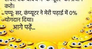 पत्नी: तुम्हें मेरी याद आती है?पति: हाँ, जब भी बिजली जाती है।😊😊😊😊 ************************************** संता: यार, मेरी घड़ी खराब हो गई।बंता: क्यों?संता: अब समय देखने के लिए मैं मोबाइल देखता हूँ!😊😊😊😊 ************************************** टीचर: एक वाक्य में “कंप्यूटर” का प्रयोग करो।पप्पू: सर, कंप्यूटर ने मेरी पढ़ाई में 0% योगदान दिया।😊😊😊😊 ************************************** पप्पू: मम्मी, आज स्कूल में मेरी तारीफ हुई।मम्मी: क्यों बेटा?पप्पू: सर …