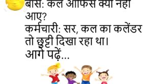 बॉस: कल ऑफिस क्यों नहीं आए? कर्मचारी: सर, कल का कलेंडर तो छुट्टी दिखा रहा था।😊😊😊 ****************************************** मोहन: तुम्हारा स्मार्टफोन चोरी हो गया। सोहन: कोई बात नहीं, मैं उसे लॉक कर दूँगा। मोहन: लॉक? चोरी हो गया, फोन नहीं!😊😊😊 ****************************************** बच्चा: मम्मी, मैं बड़ा होकर क्या बनूँ? मम्मी: बेटा, अच्छा आदमी बनना। बच्चा: अच्छा, फिर मैं नौकरी से भाग जाऊँगा!😊😊😊 …
