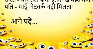 डॉक्टर – आपको क्या तकलीफ़ है? मरीज – बीवी बार-बार कहती है “तुम सुधर जाओ”, डॉक्टर साहब, ये कौन-सी बीमारी है?😊😊😊😊 ********************************* पप्पू – पापा, शादी क्या होती है? पापा – बेटा, WiFi कनेक्शन जैसा है… शुरू में पासवर्ड सबको बताते हो, बाद में खुद पछताते हो।😊😊😊😊 ********************************* दोस्त – यार तेरी बीवी इतनी खामोश क्यों रहती है? पति – …