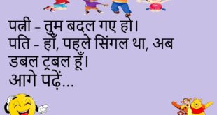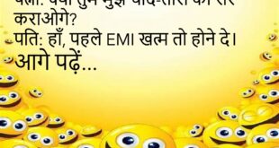 दोस्त: यार, तेरी बीवी बहुत बोलती है। पति: हाँ, लेकिन मैं तो उसे सुनता ही नहीं।😊😊😊😊 ******************************************* पत्नी: क्या तुम मुझे चाँद-तारों की सैर कराओगे? पति: हाँ, पहले EMI खत्म तो होने दे।😊😊😊😊 ******************************************* पप्पू: पापा, मैं बड़ा होकर क्या बनूँगा? पापा: बेटा, मोबाइल का चार्जर बन जा… सबको तेरी ज़रूरत होगी।😊😊😊😊 ******************************************* डॉक्टर: तुम रोज़ दौड़ा करो। मरीज: किसके …