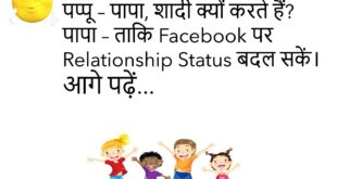 पप्पू – पापा, शादी क्यों करते हैं? पापा – ताकि Facebook पर Relationship Status बदल सकें।😊😊😊😊😊 ********************************************** गर्लफ्रेंड – मुझे दुनिया घूमनी है। बॉयफ्रेंड – पहले अपने मोहल्ले का तो घूम लो।😊😊😊😊😊 ********************************************** पत्नी – मैं मायके जा रही हूँ। पति – जाते समय Light भी ले जाना, बिल कम आएगा।😊😊😊😊😊 ********************************************** टीचर – बताओ बच्चो, Earth गोल क्यों है? …