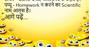 टीचर – बताओ बच्चो, आलस किसे कहते हैं? पप्पू – Homework न करने का Scientific नाम आलस है।😊😊😊😊😊 ********************************************** पत्नी – सुनो, मैं बूढ़ी तो नहीं लगती? पति – नहीं, तुम तो Prepaid Plan जैसी हो… Expiry Date आगे बढ़ती ही रहती है।😊😊😊😊😊 ********************************************** डॉक्टर – आपको आराम की ज़रूरत है। मरीज – डॉक्टर साहब, आराम ही तो कर रहा …