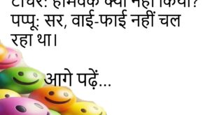टीचर – बच्चो, Good Habit बताओ। पप्पू – Free Wi-Fi मिलते ही Connect कर लेना।😊😊😊😊😊 ********************************************** पति – तुम मुझसे सबसे ज्यादा क्या चाहती हो? पत्नी – Credit Card।😊😊😊😊😊 ********************************************** दोस्त – यार, बीवी को कैसे खुश रखते हो? संता – बस Mobile हाथ से मत छीनो।😊😊😊😊😊 ********************************************** पत्नी – मुझे Gold चाहिए। पति – तुम Facebook पर Smile डालो, …