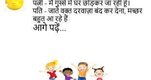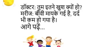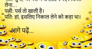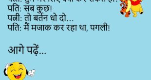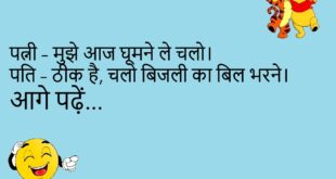 पत्नी – सुनो, मैं तुम्हारे बिना मर जाऊंगी। पति – तो प्लीज़, मुझे पहले से बता देना ताकि मैं टाइम पर फूल ऑर्डर कर सकूँ।😊😊😊😊 **************************************** टीचर – शादी और जेल में क्या फर्क है? पप्पू – जेल में अच्छे बिहेवियर पर जल्दी छुट्टी मिल जाती है।😊😊😊😊 **************************************** पत्नी – तुम मुझसे कितना प्यार करते हो? पति – इतना कि …
