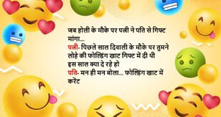 साली- जीजा जी क्या आप मेरे लिए शेर को मार के ला सकते हो? जीजा- नो साली जी, कुछ और बताओ। मैं तुम्हारे लिए और कुछ भी कर सकता हूं.. साली- क्या मैं तुम्हारा फेसबुक चेक कर सकती हूं जीजा- कहां है वो शेर जिसके बारे में तुम बात कर रही थी?😆🤣🤣🤣🤣😝😝😝 *************************************************************************************** पत्नी ने रात को 02 बजे नींद …