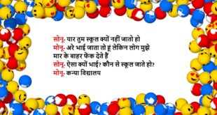 मोहन- जिसकी स्टोरी में उदास शायरी आ जाए तो समझ लेना, सोहन- क्या? मोहन- यही कि उसका बाबू किसी और के काबू में आ गया है…….😆🤣🤣🤣🤣😝😝😝 *************************************************************************************** गप्पू (पप्पू से)- यार पेट कम करने का कोई उपाय बताओ? पप्पू- फोटो छाती तक खिंचाया कर उपाय सुनकर गप्पू के होश उड़ गए……😆🤣🤣🤣🤣😝😝😝 *************************************************************************************** लड़का (फोन पर)- हैलो रिया, मैं तुम्हारे बिना …