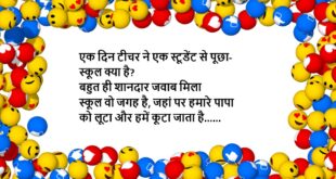 90 साल के दादाजी मृत्यु के बाद स्वर्ग पहुंचे स्वर्ग में खूबसूरत अप्सराओं का नृत्य देख कर दादाजी फूट-फूट कर रोते हुए बोले, योगा के चक्कर में नहीं पड़ा होता, कब का यहां पहुंच गया होता…..😆🤣🤣🤣🤣😝😝😝 *************************************************************************************** लड़का परीक्षा हॉल में परेशान बैठा था टीचर- क्या हुआ प्रश्न कठिन हैं क्या? लड़का- नहीं सर, मैं तो ये सोच रहा हूं …