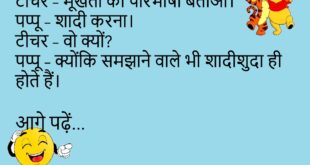 टीचर: इतने दिन कहाँ थे? स्टूडेंट: सर, डॉक्टर ने कहा था “घर पर रहो”… और मैंने डॉक्टर का मतलब समझा ही नहीं।😊😊😊😊😊 ********************************************* पत्नी: सुनिए जी, मुझे मॉल चलना है। पति: ठीक है, पर बैंक में पहले सैलरी तो है ना?😊😊😊😊😊 ********************************************* पप्पू डॉक्टर के पास गया। डॉक्टर: क्या हुआ? पप्पू: सर, मुझे भूलने की बीमारी हो गई है। डॉक्टर: …