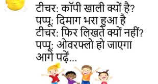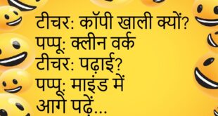 टीचर: सवाल समझ में आया? पप्पू: पूरा आया टीचर: फिर खाली कॉपी? पप्पू: जवाब छुट्टी पर चला गया 😆 ********************************** टीचर: इतना लेट क्यों आए? पप्पू: रास्ता लंबा था टीचर: स्कूल तो पास है पप्पू: दिमाग से 😜 ********************************** टीचर: होमवर्क क्यों नहीं किया? पप्पू: किया था टीचर: फिर लाए क्यों नहीं? पप्पू: हवा बहुत तेज़ थी 😂 ********************************** टीचर: …