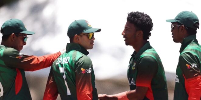 बांग्लादेश की अंडर-19 टीम, जूनियर टाइगर्स, 26 जनवरी, 2026 को बुलावायो के क्वींस स्पोर्ट्स क्लब में अपने सुपर सिक्स के पहले मैच में इंग्लैंड से सात विकेट से हारने के बाद ICC U19 पुरुष क्रिकेट वर्ल्ड कप 2026 से बाहर हो गई। पहले बल्लेबाजी करते हुए, बांग्लादेश 38.1 ओवर में 136 रन पर ऑल आउट हो गया, जबकि इंग्लैंड ने 24.1 ओवर में 137 रन बनाकर मैच जीत लिया (थॉमस रेव ने सबसे ज़्यादा 59* रन बनाए)। ग्रुप स्टेज से सिर्फ़ एक पॉइंट (नतीजों और एक मैच रद्द होने के कारण) के साथ, इस हार ने उन्हें सेमीफाइनल की दौड़ से बाहर कर दिया।